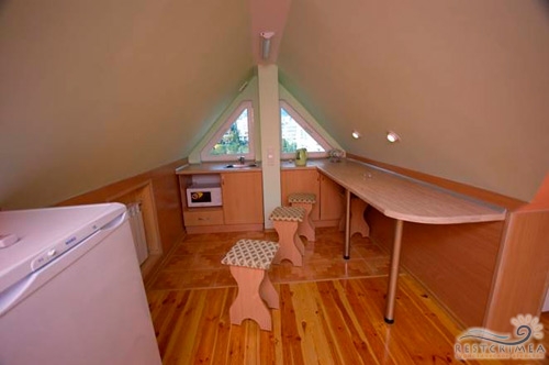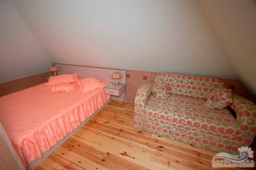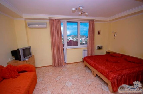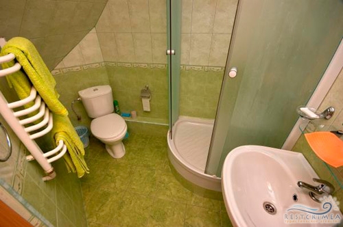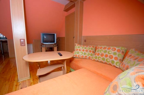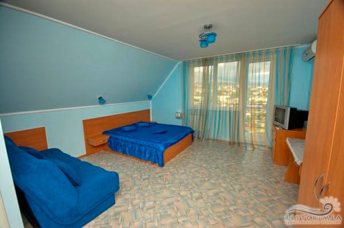 В номере: 2-х спальная или две 1-но спальные кровати и раскладной диван, современная мебель, телевизор, холодильник, кондиционер, чайник, столовая и чайная посуда, сейф. Номера оборудованы современным санузлом (душ, унитаз, раковина, по два полотенца) - 2-х комнатный номер категории «Апартаменты». Номер на верхнем этаже (под крышей здания).