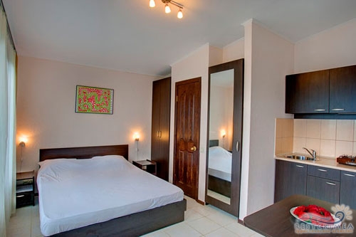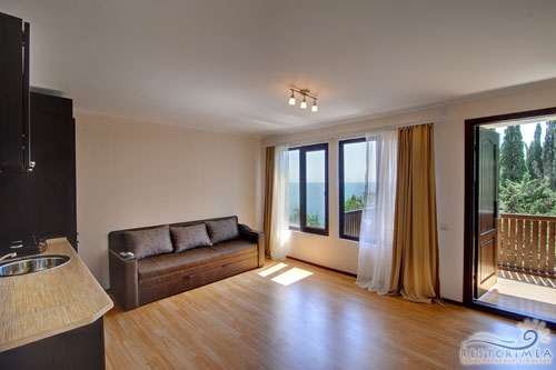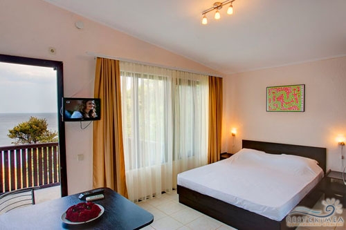 В номере: кондиционер, телевизор, отдельная терраса с плетенной мебелью, кухня, холодильник, плита, вся необходимая посуда. Вид на море. Дополнительное место - евродиван. - Suite Park View (2-местный 2-комнатный улучшенный номер). Площадь номера 42 кв.м. Просторный номер с удобствами (туалет, умывальник, душ).