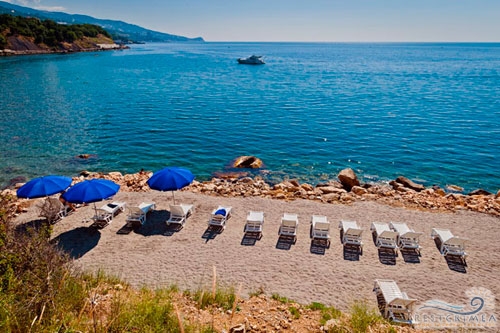 Пляж галечный. На пляже также есть кафе с разнообразным меню и ассортиментом напитков.