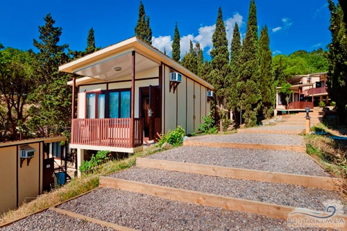В номере: мини-кухня, газовая плита, посуда, холодильник. Вид на парк. Отдельный вход в номер и своя терраса. Домики расположены в начале комплекса, рядом с административным зданием, возле центральной аллеи, недалеко от выхода к морю. Дополнительное место - еврораскладушка.
