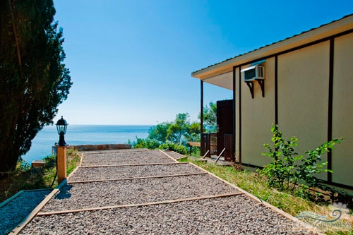 В номере: мини-кухня, газовая плита, посуда, холодильник. Вид на море. Первая береговая линия. Дополнительное место - еврораскладушка. - Side Sea View (2-местный номер с боковым видом на море). Площадь номера 18 кв.м. Номер с удобствами (туалет, умывальник, душ).