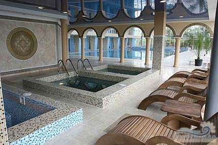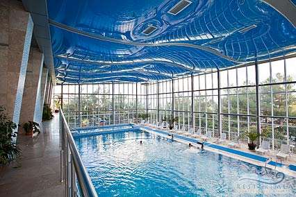 - 2 этаж - комплекс с пятью видами бань, русская, турецкая, финская и две аромобани, гидромассажных, водно-воздушных ванн, виброкапсул и душей; бассейны с контрастной водой, фитобар.