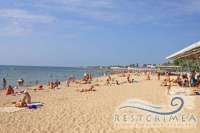Собственный оборудованный (лежаки, навесы, кабинки для переодевания) песчаный, мелководный пляж, в 50 м от корпуса.