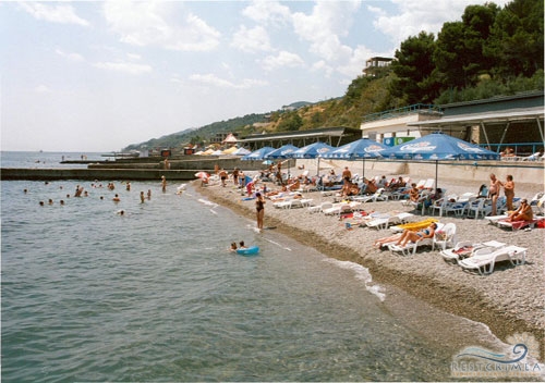 Собственный (протяженностью 220 м) галечный, оборудованный (лежаки, топчаны, шезлонги, зонтики, теневые навесы), в 10 минутах ходьбы по парку или спуск на лифте от спальных корпусов.