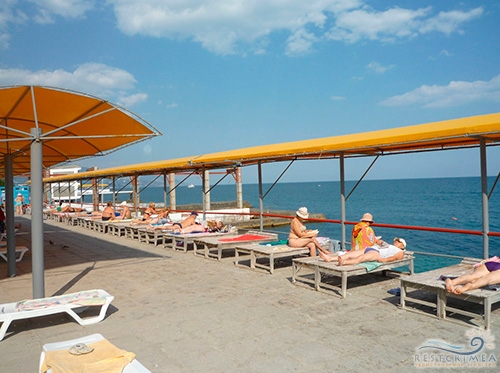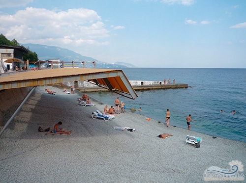 Власний, гальковий. Спуск на пляж від стаціонарного корпусу - власної підвісної канатної дорогою, довжиною 140 метрів. Пляж обладнаний кабінками для перевдягання, навісами, лежаками; на пляжі - бар, човнова станція, прокат пляжного обладнання та водних засобів.