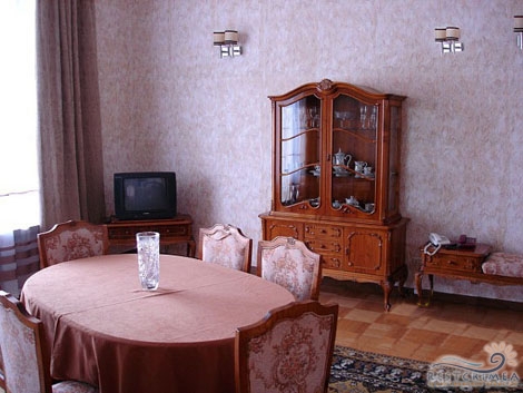 - Однокімнатний 2-х місний номер «люкс». Площа 70 кв.м. У номері: санвузол (умивальник, туалет), ванна кімната (ванна, душ, два умивальника, біде, кушетка); м'яка і вбудовані меблі; телевізор, холодильник, телефон, кондиціонер; набір посуду, міні-сейф; лоджія з кушеткою.